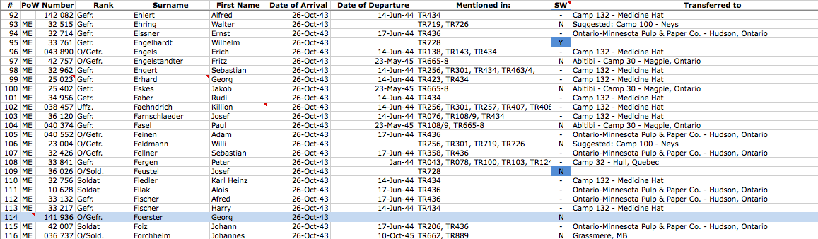 As I am interested in how individuals experienced internment, the next step for me was to create a database of the 440 PoWs interned in Manitoba’s Riding Mountain National Park. With this, I am now able to determine how long a PoW was at Riding Mountain, their role/occupation/trade, rough date of their capture, etc. and, in some cases, I was able to find reports dealing with escape attempts and political allegiances. Posting some of this research online (at www.prisonersinmb.blogspot.ca), I have been extremely fortunate enough to have made contact with former PoWs and their families. My database allows me to quickly search for document pertaining to these individuals, allowing family members to retrace the steps of their relatives.
