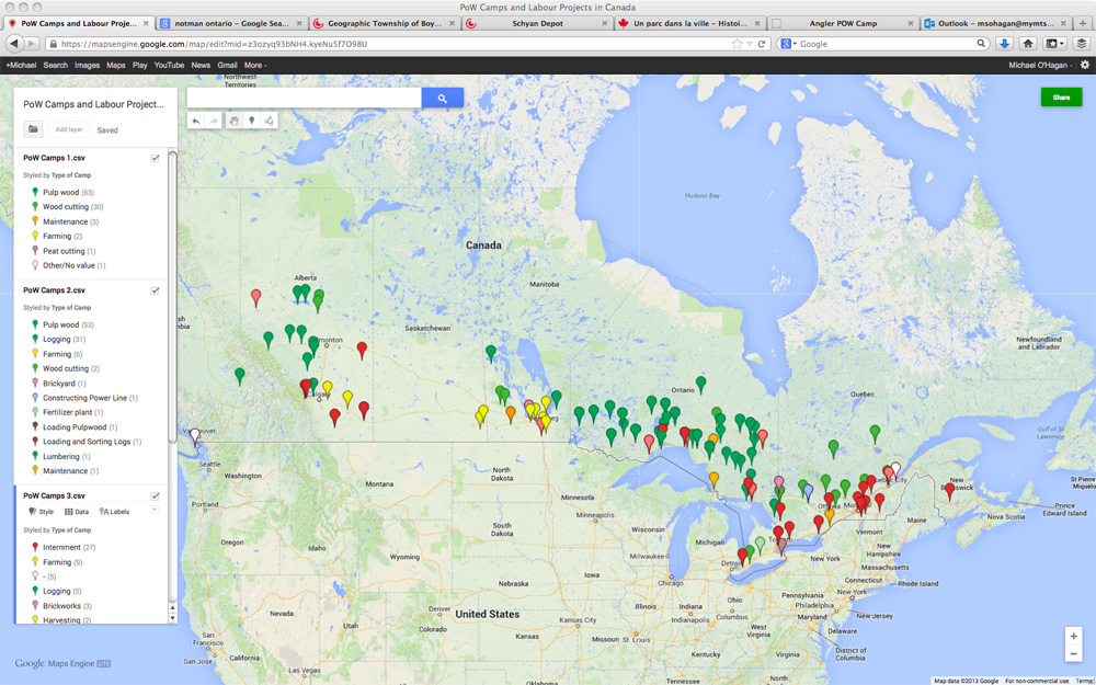 Anyways, on to the mapping. My database was based primarily on bi-weekly and monthly statistical reports produced by the Department of Labour that kept track of PoWs employed on labour projects and various statistical reports on internment camps. I should also note that there were gaps in my records that I have yet to fill so it is not a completely accurate depiction of PoWs in Canada. From these records, I was able to obtain basic details such as a general location (usually just a town or city name), the employer, the amount of PoWs employed, the number of guards, the nature of work, etc. As I had already spent the summer entering this data into excel, all I had to do was import the data into Maps Engine Lite and let it work its magic.