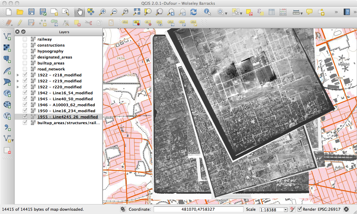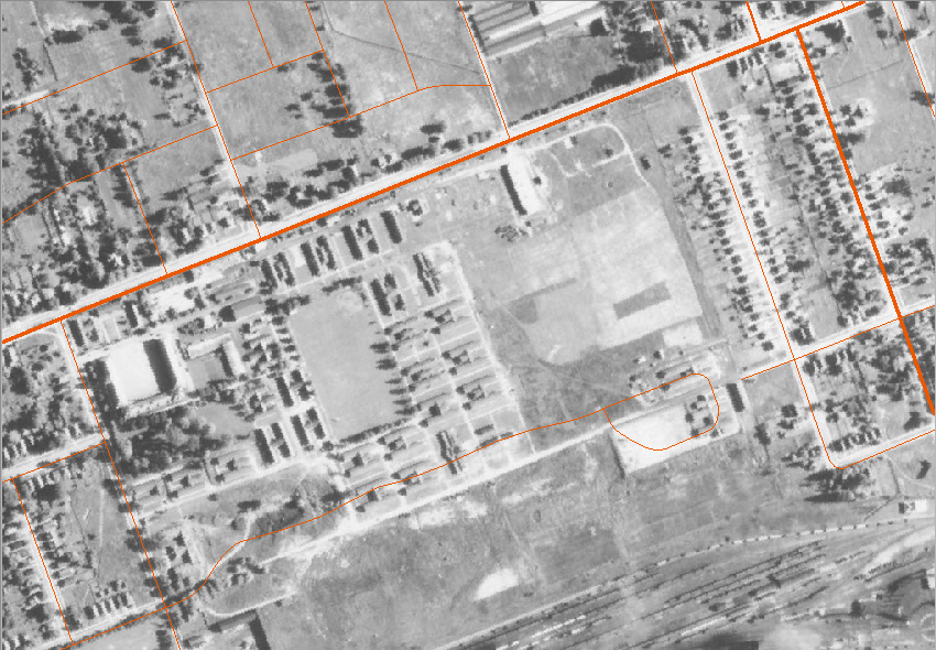 Looking at the layers individually, you can see the transformation of the site as Canada mobilized and demobilized for the Second World War. I left the road layer on as this is what I primarily used for georeferencing. You’ll notice it isn’t quite perfect but for what I needed, it does the job! Wolseley Barracks is the U-shaped building in the middle of the left hand side of the picture.