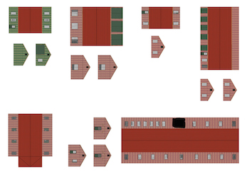 I have now finished the physical model of the camp. As I mentioned in an earlier post, the model is on a foam board overlain with an aerial photograph of the site. The buildings were scaled to size and built with a foam frame. I then copied the textures from my digital model, scaled them down, and produced a fold- and cut-out version that could be wrapped around the frames.