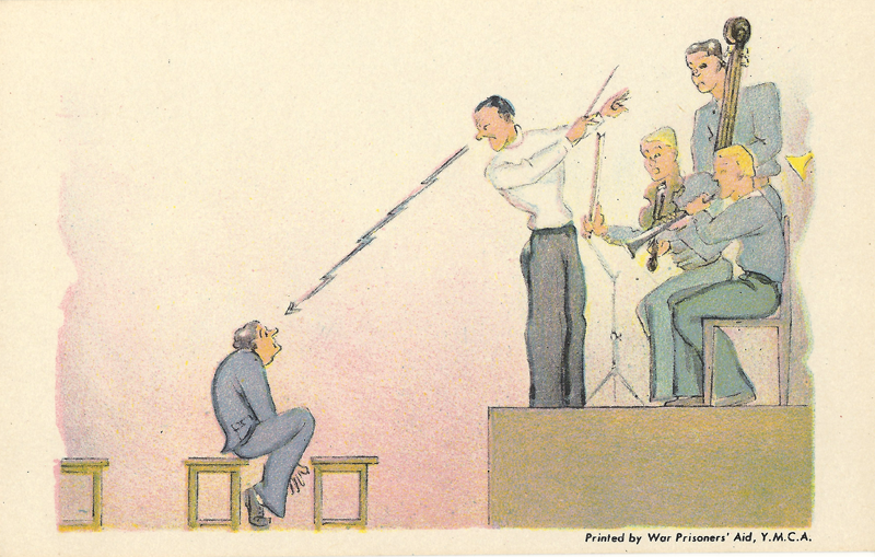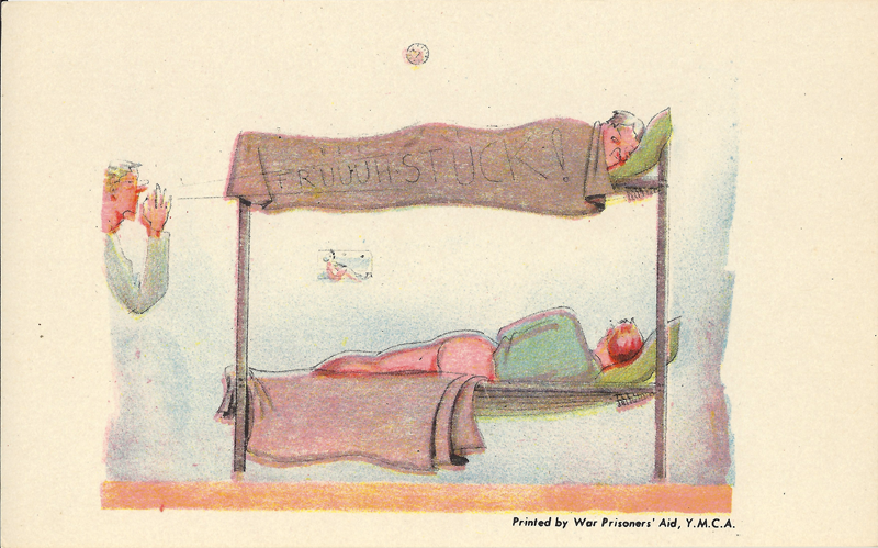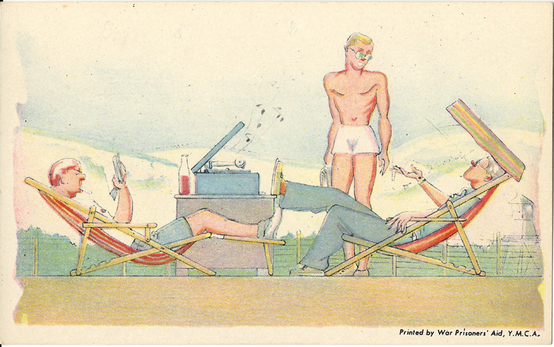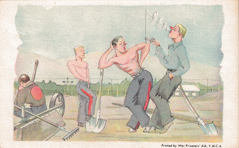 The postcards featured artwork by two PoWs, one of who was reportedly Karl Kafka. The postcards were printed by the YMCA and were made available for purchase in the camp canteens. Many of the cards feature aspects of the day-to-day life in a Canadian PoW camp while others, as you can see below, portrayed camp life and work in a more humorous fashion. Some of the meanings of the cards are beyond me so if you have any insight into any of these cards, please leave a comment below!
