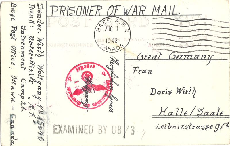 Front and rear of picture postcard sent by Uffz. Wolfgang Wirth to his wife, Doris. Wirth is in the back row, middle. Picture taken at Camp 133, Lethbridge, Alberta. Note the mix of civilian and military clothing as well as the two dogs in the front row.