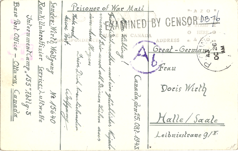 Front and reverse Picture Postcard send by Uffz. Wolfgang Wirth to his wife, Doris. The picture was taken at Camp 21 in Espanola, Ontario. Wirth is in the back row, middle.