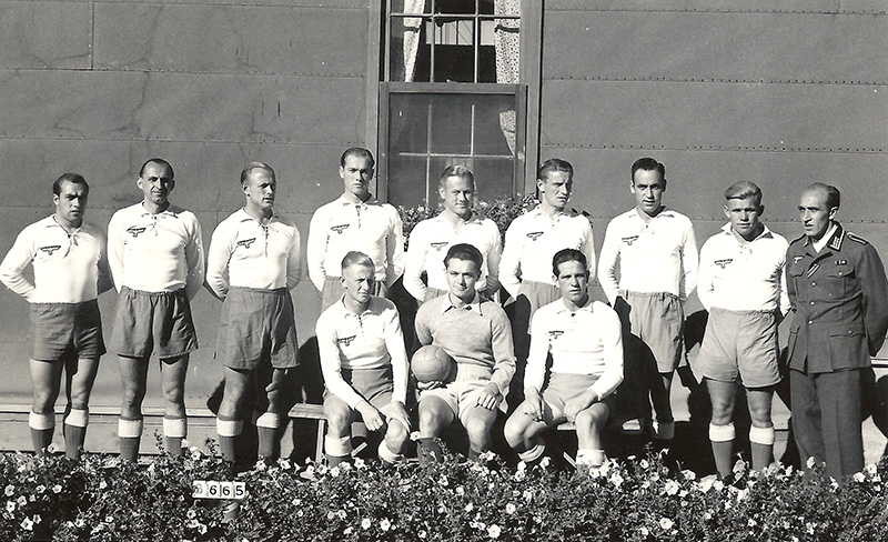 Hello, I think I can recognize my granddad – Soccer Team at Lethbridge – he is the one on the right first row (sitting), Camp 133. My granddad was there as POW – we have a postcard that confirms that he was at Lethbridge from 1944. He was a keen soccer and handball player so I am pretty sure it is him.