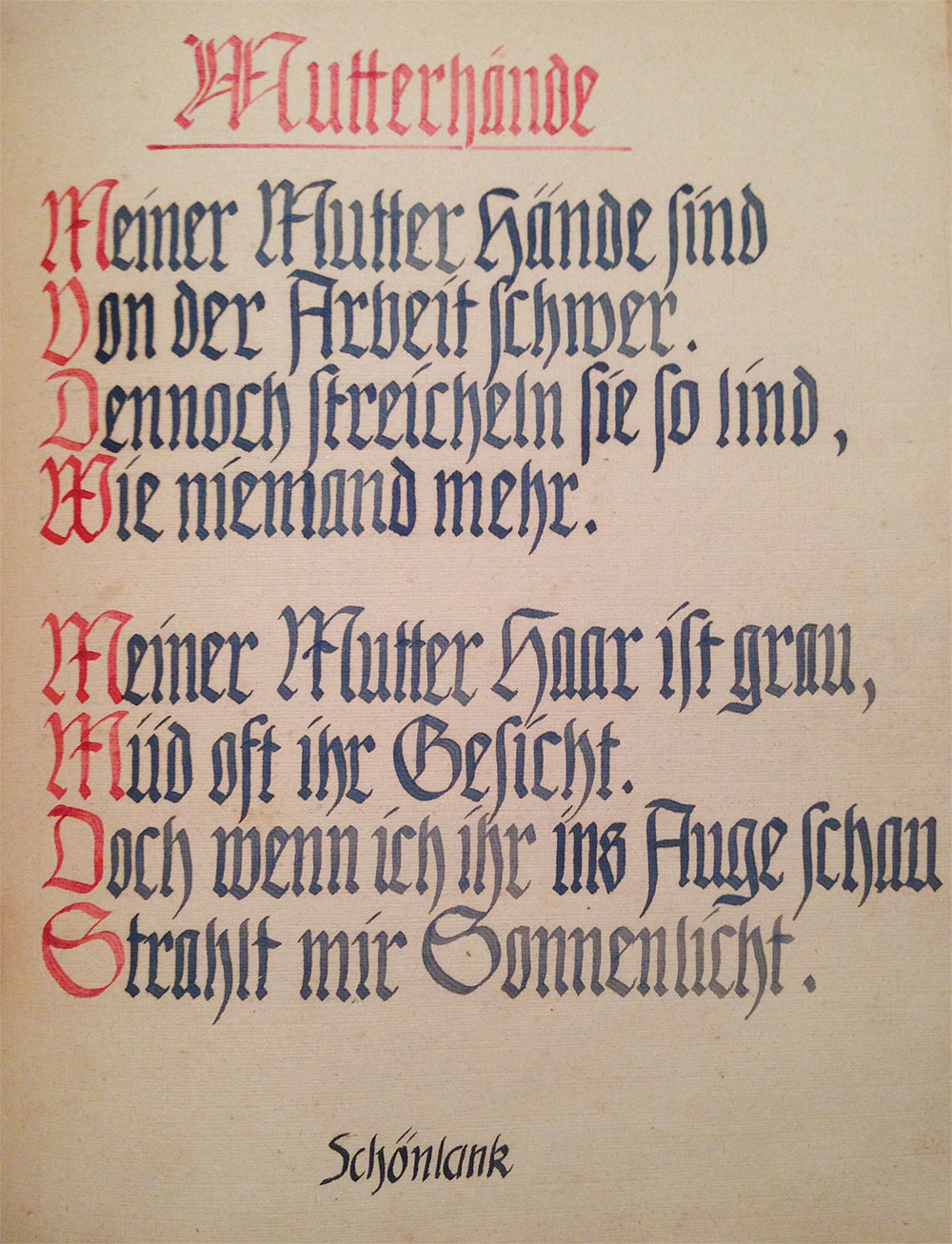 Sometime during his internment in Canada, PoW Albert Ammer wrote one of Bruno Schönlank’s poem in the empty pages of his copy of Ein Kleines Buch, a PoW-produced book describing life at Camp 132 in Medicine Hat, Alberta.