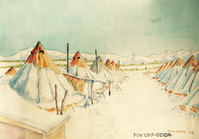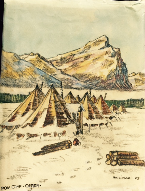Last year, I wrote a post featuring some artwork by PoW Richard Schlicker. My hopes were that others would come forward with more examples of Schlicker’s artwork and, a year later, the result was just that. Laura stumbled across my blog and emailed me three pictures of paintings from Richard Schlicker that her father purchased while serving as a camp guard, likely at Lethbridge. All three feature scenes at Camp 133 – Ozada, Alberta and, like those in my earlier post, were probably purchased at one of the art and craft sales hosted by the PoWs at Camp 133 in Lethbridge.