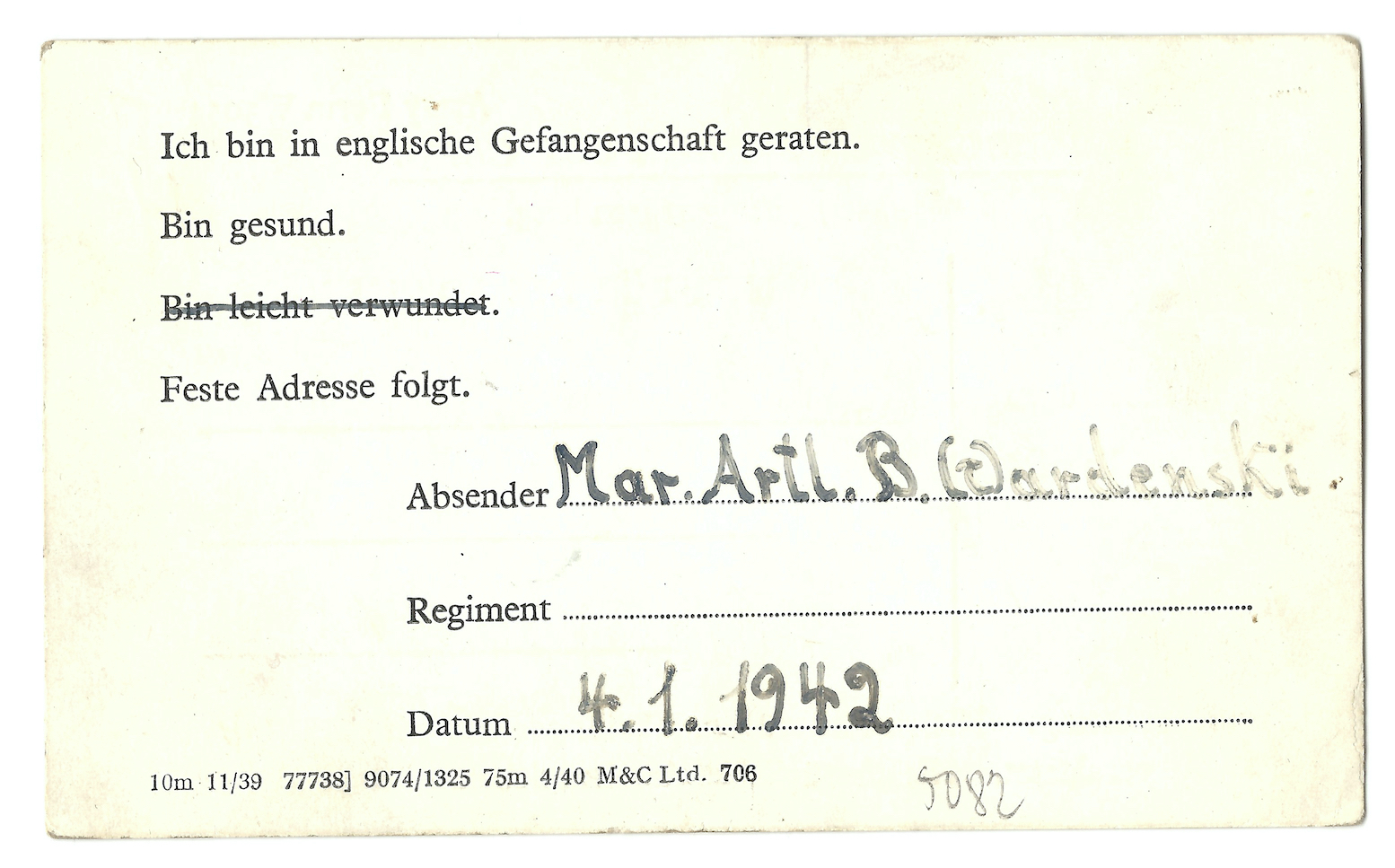 Although the German Navy and his family believed him dead, Wardenski was in fact alive and well. Captured by British Commandos, Wardenski was evacuated from Måløy and, after a short voyage, arrived in the UK in the first few days of January 1942. In accordance with the 1929 Geneva Convention, Wardenski was permitted to notify his family of his capture and, on January 4, he used a pre-printed card to let them know that he was in English captivity, in good health, and an address would follow.