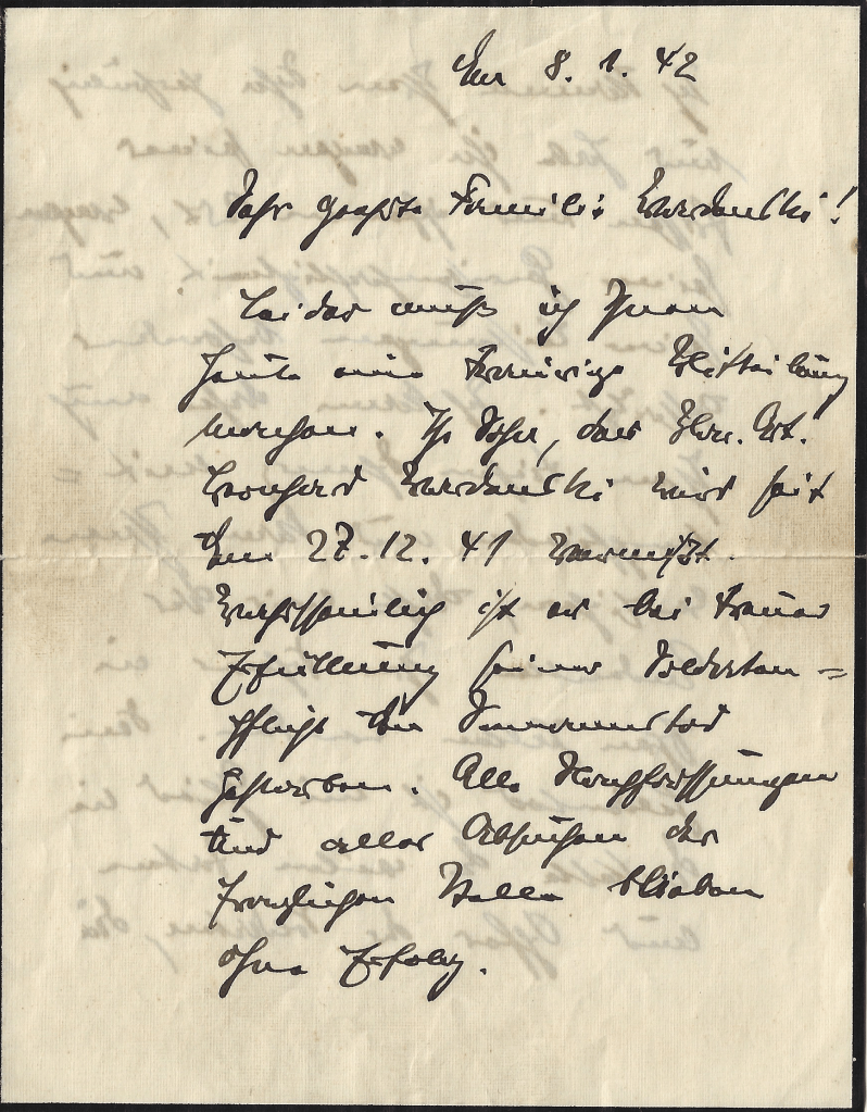 Unfortunately, I have to give you a sad message today. Your son, the Mar. Art. Gerhard Wardenski has been missing since December 27, 1941. He probably died if he fulfilled his duty as a soldier. All investigations and searches of the position in question were unsuccessful.