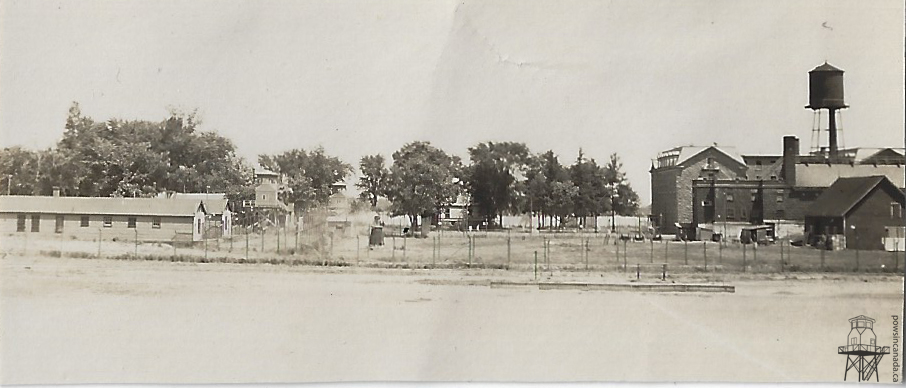 The print itself is printed on thin paper with a single colour (black) but it shows remarkable detail. Smoke billows from the camp’s coal-powered heating plant and the four-storey building housing 500 German officers in semi-private rooms is visible in the background. Barbed wire fences separated the main enclosure from the recreation field in the foreground but the latter remained accessible by the elevated footbridge seen on the right. Two prisoners can be seen crossing the bridge while a close look reveals a guard standing on the guard tower’s catwalk and another standing watch in the upper level. A small dog laps at one of several puddles – all of which show reflections of the camp – while several POWs walk laps around the recreation field for exercise.