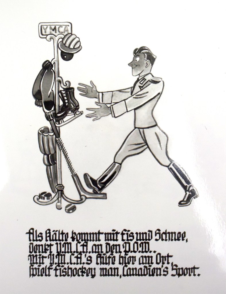 POW Georg Mally’s 1945-dated cartoon shows hockey equipment donated by the War Prisoners’ Aid of the YMCA. The text can be translated to: “As the cold arrives with ice and snow, The Y.M.C.A thinks of the P.O.W., Here, at this place, with the help of the Y.M.C.A., One can play (ice)hockey, Canadian’s sport.” Hermann Boeschenstein Fonds, University of Toronto Archives.