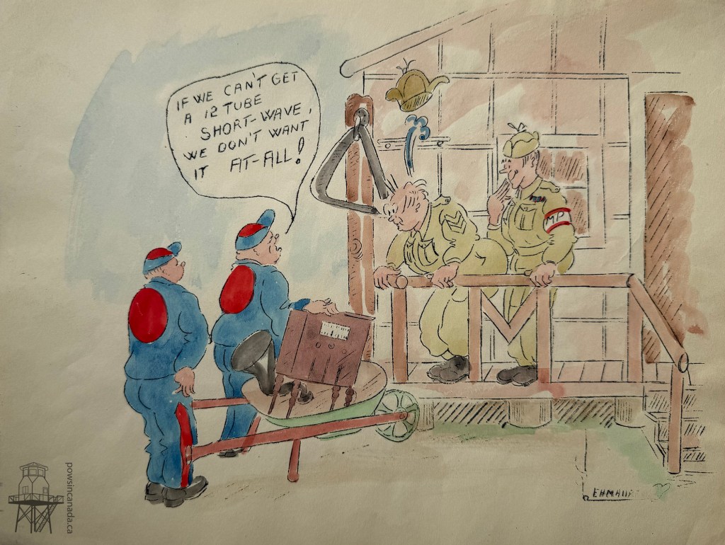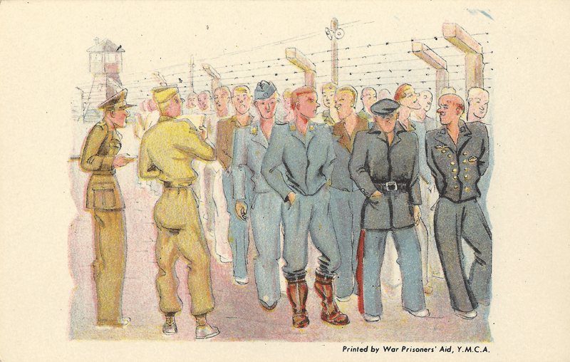 While I am not aware of other cartoons in this series, Ellmaurer did continue sketching and painting at Camp 70. Among his works was a series that, along with some art from fellow POW artist Joachim von Quillfeldt, was selected by the War Prisoners’ Aid of the YMCA for use as souvenir postcards for prisoners of war interned throughout Canada.