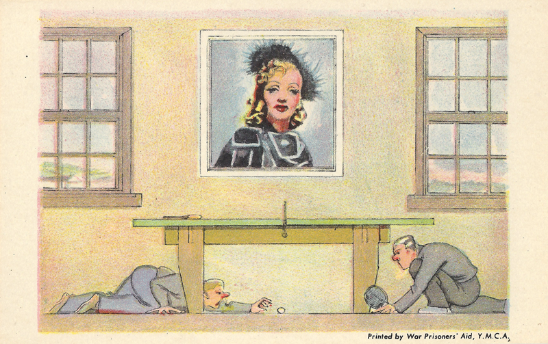 While some escapees were caught in action, guards more often discovered tunnels during searches, with the help of informants, or simply by accident. This made identifying the culprits significantly more difficult and, in many cases, the potential escapees were never identified. But the next cartoon suggests a far more rare occurrence: internees confessing.