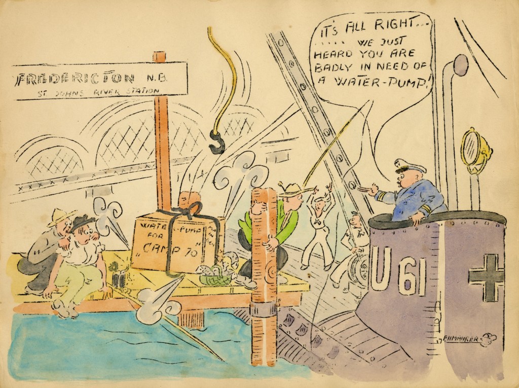 The cartoon shows German Submarine U-61 docking in Fredericton along the St. Johns River and dropping off the much-needed water pump to the surprise of the locals. While the camp did finally receive the pump in the latter half of 1942, it was sourced through official channels rather than the Germany Navy.