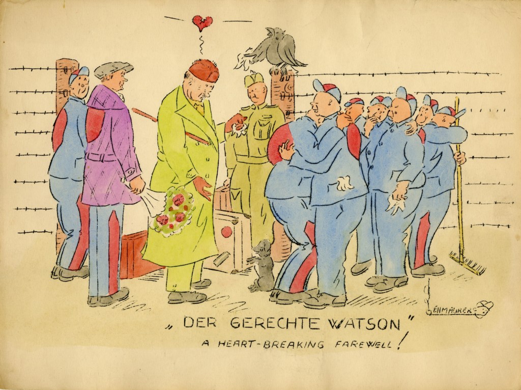 In February 1942, Lt.-Col. Hugh de Norban Watson, who had followed the POWs from Kananaskis to serve as the commandant of Camp 70, was transferred back to Camp 130. He was apparently respected by most of the internees and his departure was memorialized in an Ellmaurer print.