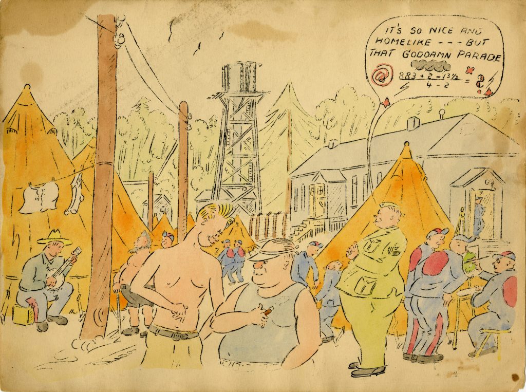 In one of the only known examples of his art from Camp B, a guard expresses his satisfaction with the camp being just like “home” – at least for a soldier, perhaps – but he is clearly dismayed with the prisoners’ lack of order during the daily parade. Notably, the internee wearing a visor and holding a cigar in the foreground is Camilliene Houde, a Quebec politician who was the Mayor of Montreal when he was interned in 1940 for protesting conscription.