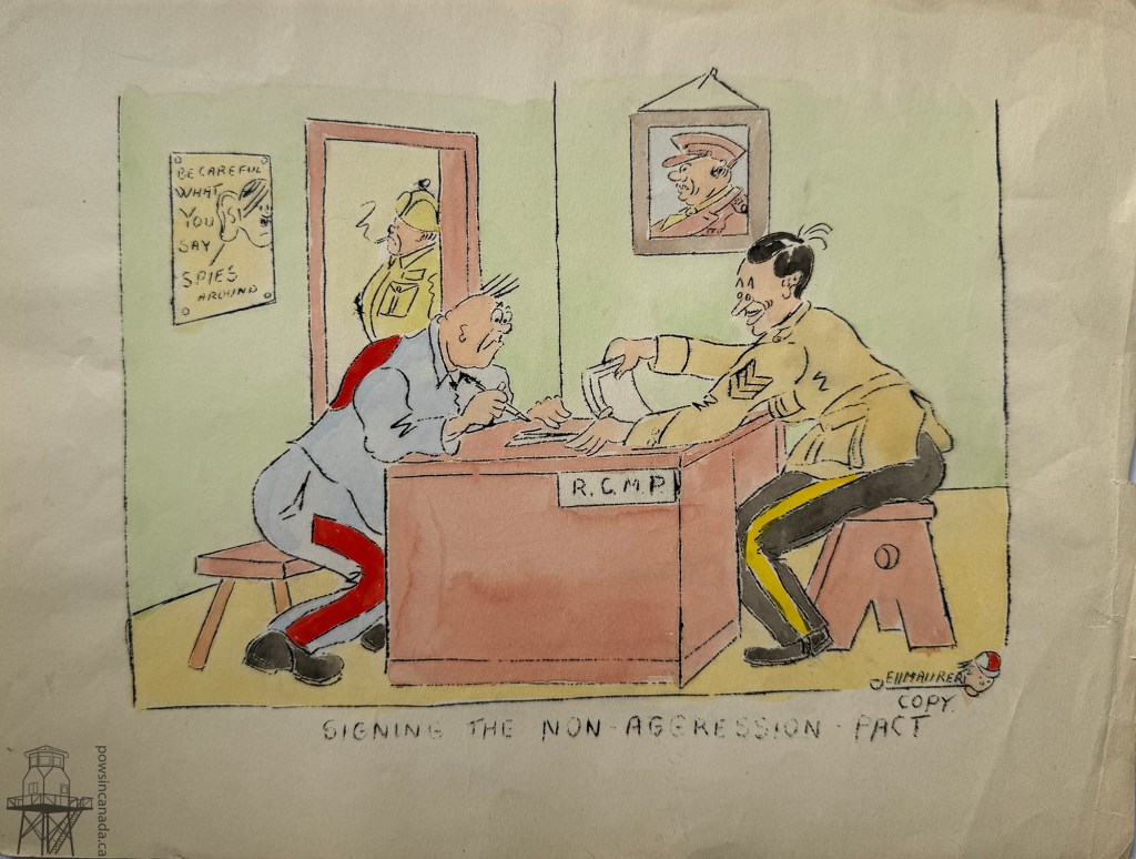 A play on the Molotov-Ribbentrop Pact, this cartoon shows an internee signing a non-aggression pact for an RCMP Sergeant. The context of the “pact” is unclear but it could be referencing the terms of an internee’s parole release. As many of these internees posed no real threat, they were gradually released on a case-by-case basis. However, this did not make them “free” as the majority of these releases were conditional and any violation of these terms could mean re-internment.