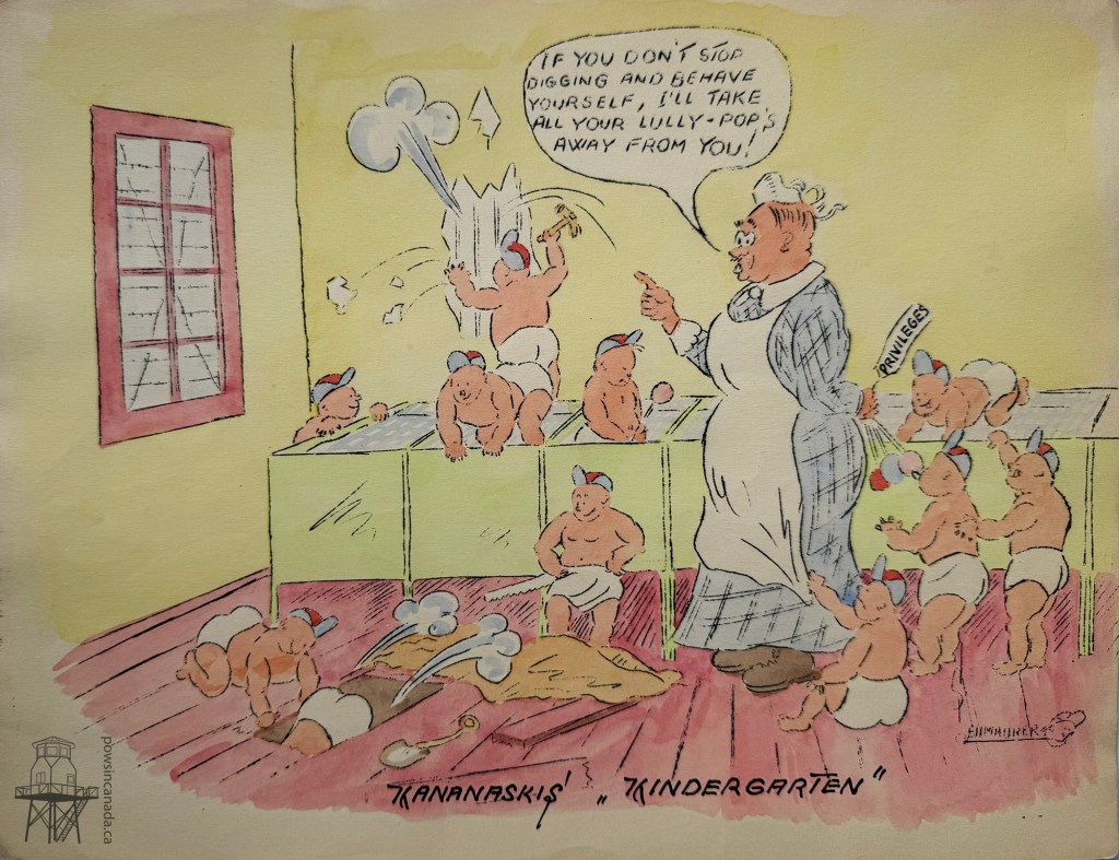 Here, Ellmaurer likens the relationship to internees as babies and the guards their nannies. Chaos appears to reign in the room, with some of the babies engaged in digging – and disappearing through – a tunnel under the floorboards, one destroys the barrack walls with a hammer, while several others are far more interested in the candies held behind the nanny’s back. Under the guards’ constant supervision and restricted in what they could do, the comparison between internees and children was apt. Threatening to remove internees’ privileges – lollipops in this case – was a very real tactic used in Canadian camps; threats to close camp canteens, remove newspapers and access to radios, cancelling recreational and work opportunities, confining POWs to quarters, or even eliminating deserts from the menus proved effective in avoiding or reducing trouble in camps.