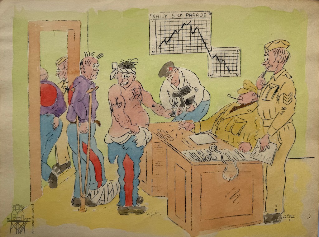 Although not apparent in this print, a copy in the Canadian War Museum shows that the jug used to pour out the cure is “Castor Oil.” Know for its laxative effect, this likely explains the internee leaving the doctor’s office with his hand on his bottom and – if that was the medical officer’s cure-all – the significant decrease in the number of prisoners seeking out medical attention…