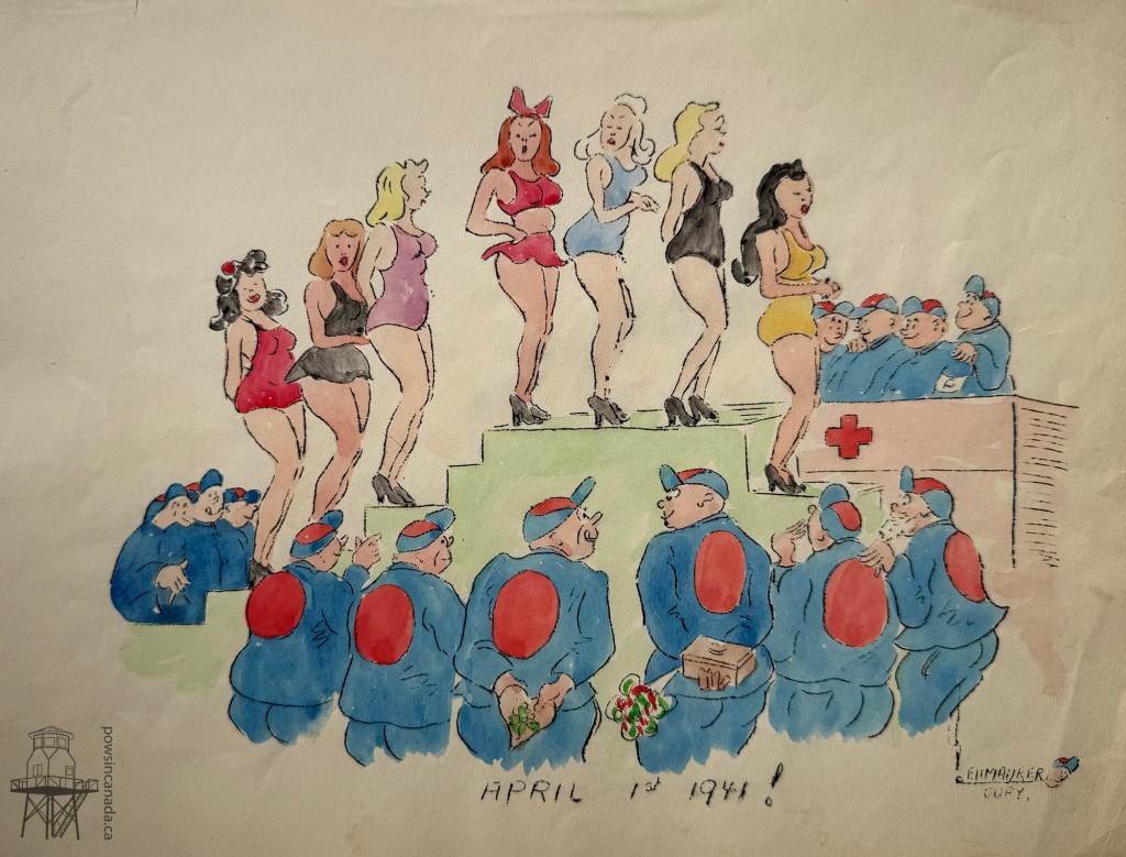 Of all of Ellmaurer’s cartoons, only one depicts women and this is not very surprising. Like the rest of Canada’s internment camps, the staff, guards, and internees in Camp K were men. Of the roughly 1,600 civilian internees arrested and detained in Canada, only twenty-one were women and they were interned in the Women’s Jail in Kingston, Ontario. As such, even sightings of women were rare occurrences in internment camps and internees’ only real contact with the opposite sex was through letters and postcards.