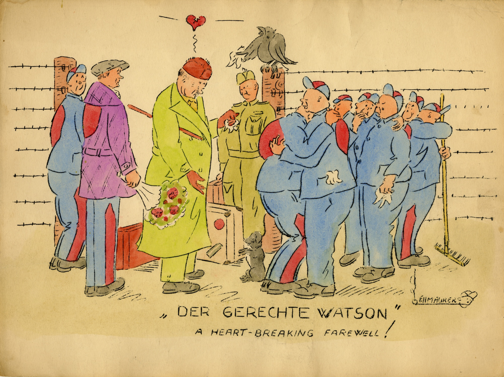 In February 1942, Lt.-Col. Hugh de Norban Watson, who had followed the POWs from Kananaskis to serve as the commandant of Camp 70, was transferred back to Camp 130. He was apparently respected by most of the internees and his departure was memorialized in an Ellmaurer print.