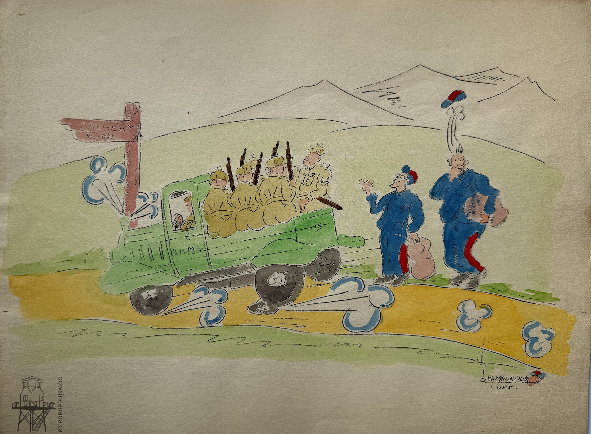 Ellmaurer was not among the lucky few to be released from Kananaskis. In July 1941, a year after arriving at Camp K, Otto Ellmaurer and the rest of the internees in camp were transferred to Camp B at Fredericton, New Brunswick as part of a reshuffling of Canadian internment operations. Departing camp by truck, the prisoners were taken to the nearest rail station and then spent the next few days traveling across the country by rail. Arriving at Camp B in early August, Ellmaurer continued to sketch and paint, although there appear to be fewer cartoons from this camp.