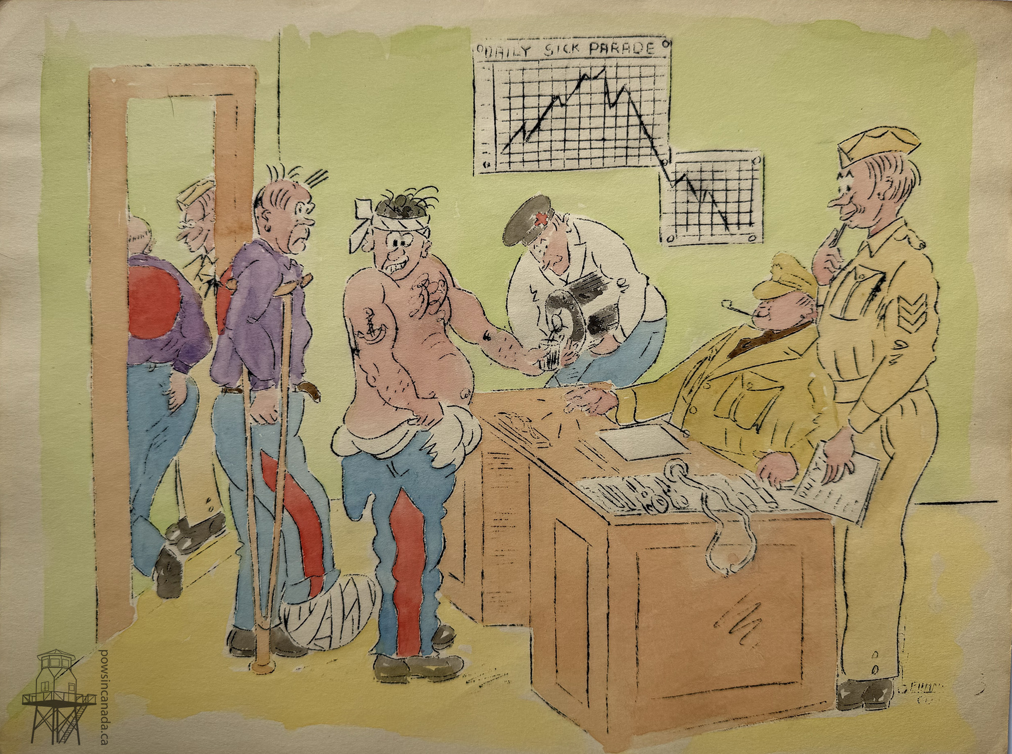 Although not apparent in this print, a copy in the Canadian War Museum shows that the jug used to pour out the cure is “Castor Oil.” Know for its laxative effect, this likely explains the internee leaving the doctor’s office with his hand on his bottom and – if that was the medical officer’s cure-all – the significant decrease in the number of prisoners seeking out medical attention…