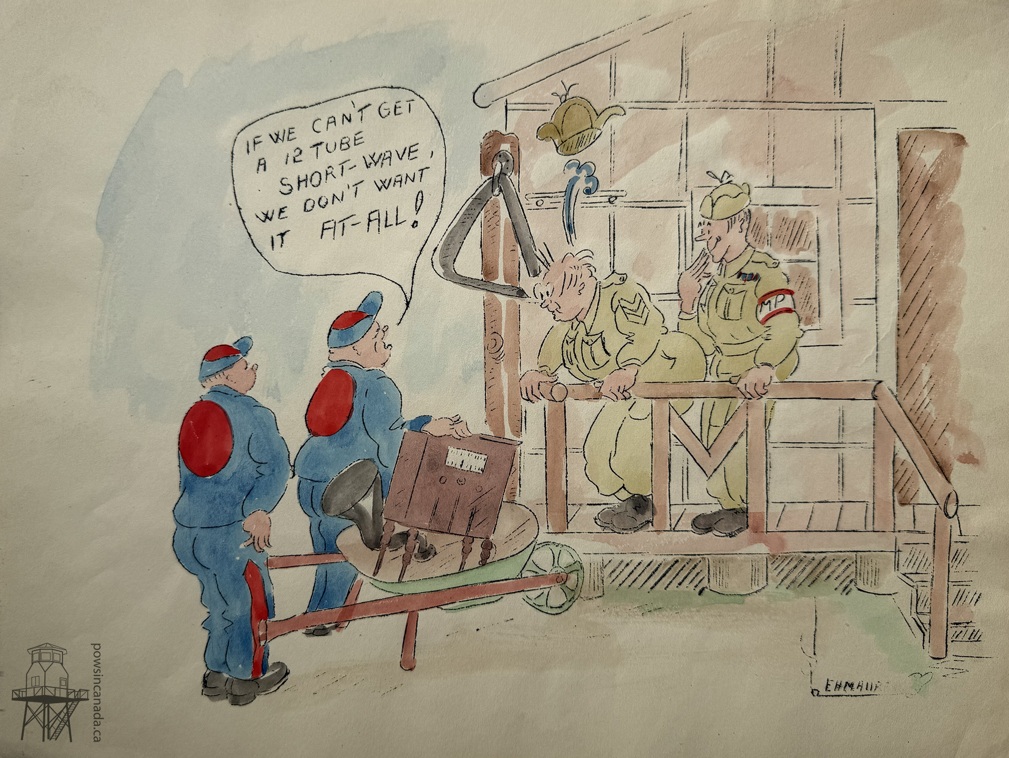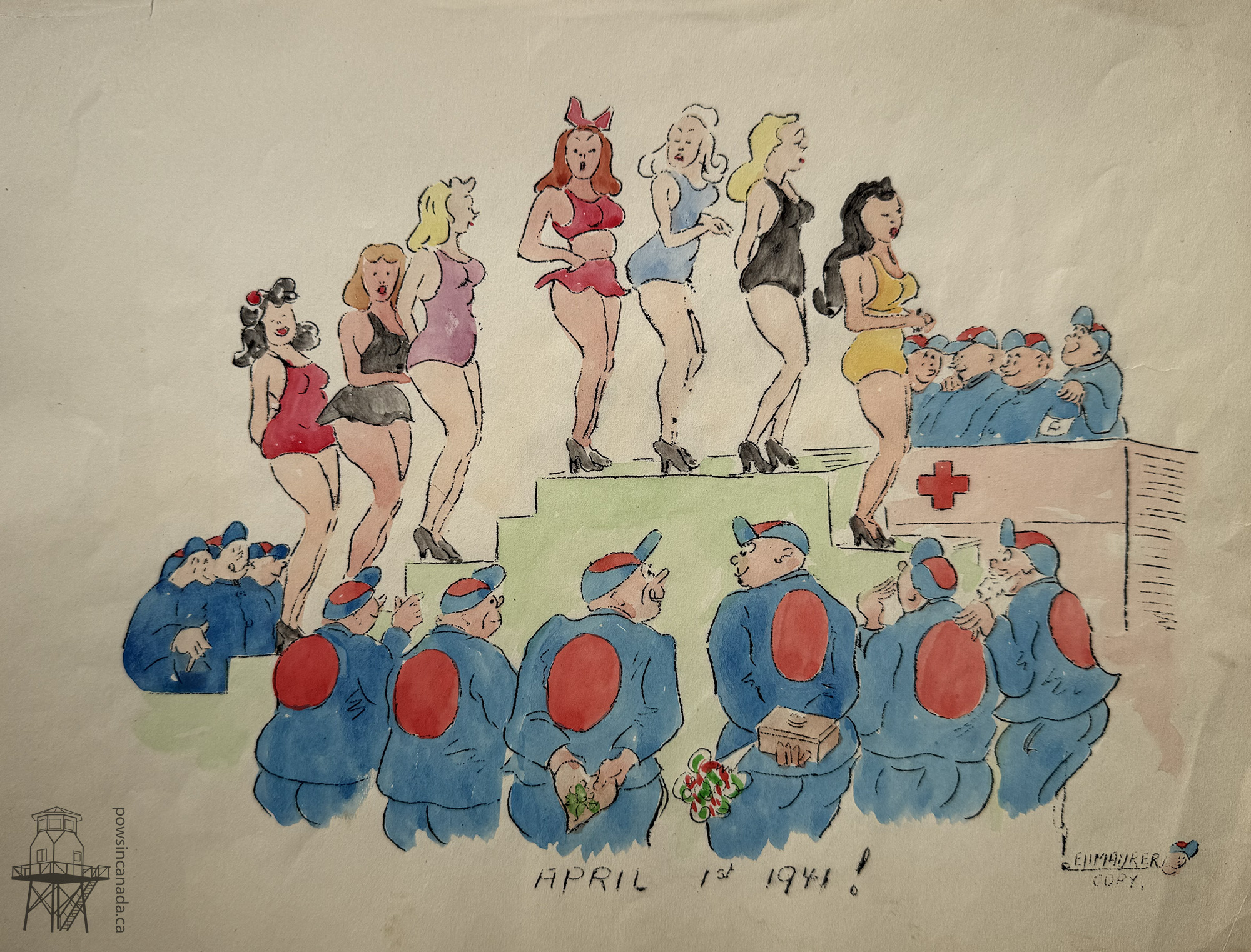 While I am not aware of other cartoons in this series, Ellmaurer did continue sketching and painting at Camp 70. Among his works was a series that, along with some art from fellow POW artist Joachim von Quillfeldt, was selected by the War Prisoners’ Aid of the YMCA for use as souvenir postcards for prisoners of war interned throughout Canada.