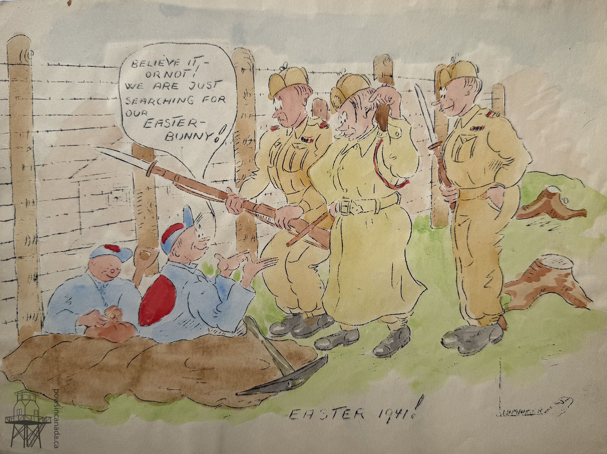 A play on the Molotov-Ribbentrop Pact, this cartoon shows an internee signing a non-aggression pact for an RCMP Sergeant. The context of the “pact” is unclear but it could be referencing the terms of an internee’s parole release. As many of these internees posed no real threat, they were gradually released on a case-by-case basis. However, this did not make them “free” as the majority of these releases were conditional and any violation of these terms could mean re-internment.