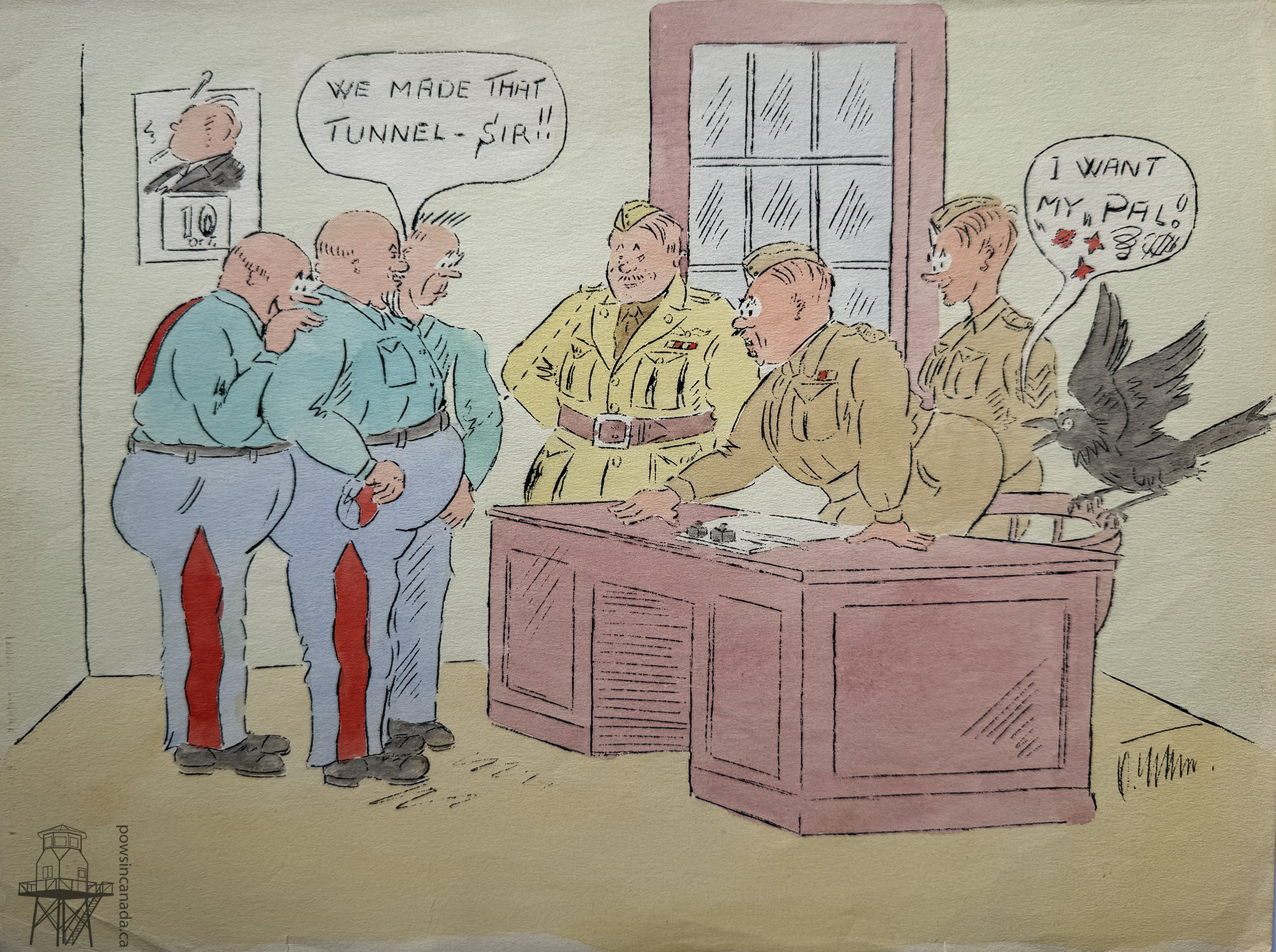 While some escapees were caught in action, guards more often discovered tunnels during searches, with the help of informants, or simply by accident. This made identifying the culprits significantly more difficult and, in many cases, the potential escapees were never identified. But the next cartoon suggests a far more rare occurrence: internees confessing.