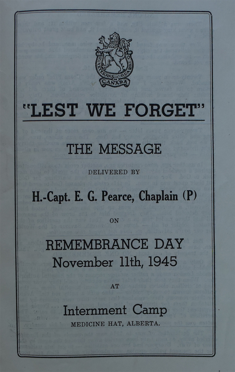 Excerpt from “Lest We Forget,” Remembrance Day Service by Chaplain H.-Capt. E.G. Pearce, Delivered at Camp 132 (Medicine Hat) on November 11, 1945. Library and Archives Canada.
