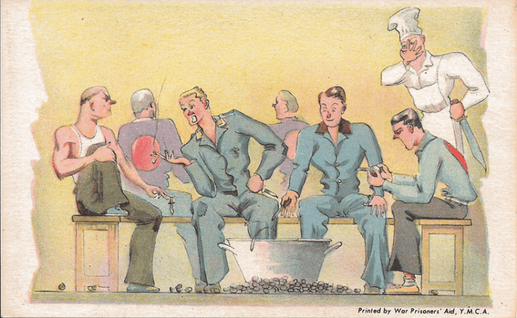 Cartoon postcard by POW working for Pigeon Timber Co. near Neys, Ontario. Author’s Collection.