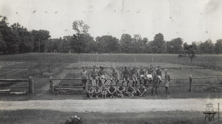A group of POWs take a break from working on their vegetable gardens near Camp 20 (Gravenhurst). The field behind was used for games. Author’s Collection.