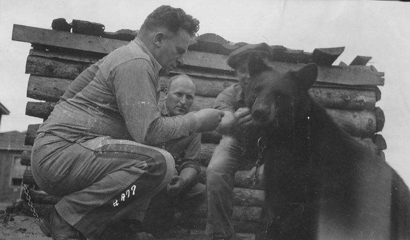In 1942 or 1943, the POWs at Neys acquired a pet black bear, “Mischka,” who became the camp mascot. Her origins are unknown, but, along with the cats and dogs in camp, appears to have been a beloved companion. Her caretaker, Max Wadephal, kept a careful watch on her and walked her in and around the enclosure.