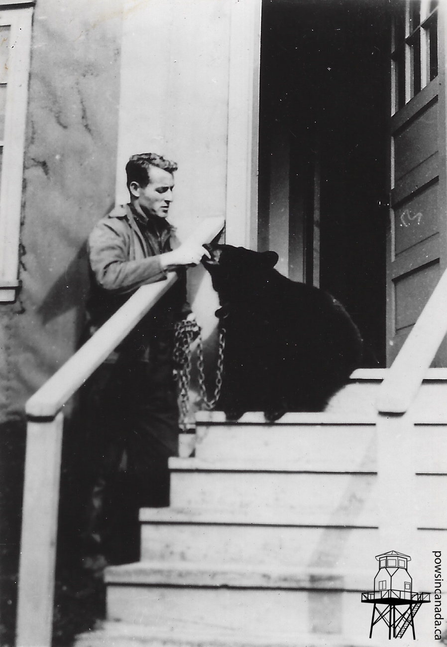 In 1942 or 1943, the POWs at Neys acquired a pet black bear, “Mischka,” who became the camp mascot. Her origins are unknown, but, along with the cats and dogs in camp, appears to have been a beloved companion. Her caretaker, Max Wadephal, kept a careful watch on her and walked her in and around the enclosure.