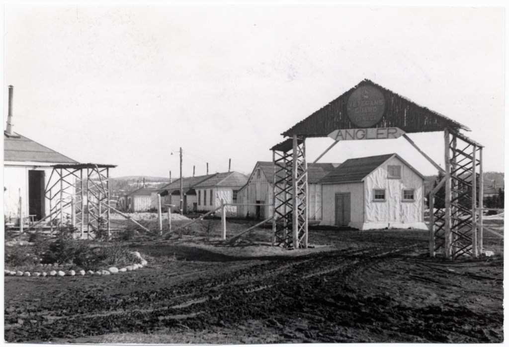 Like its sister camp at Neys, Angler had been selected for an internment camp largely due to its remote location and easy rail access. Two layers of barbed wire fencing – a total of 54km of wire – and a warning wire surrounded the unique, five-sided enclosure. Guards stood watch from five guard towers, each armed a Lewis machine gun (later replaced by Brens). Within the enclosure were four H-Huts housing the prisoners’ quarters, a 600-man kitchen and mess, a recreational hall, a tailor’s workshop, a detention hut, and a small hospital. Outside the enclosure were separate quarters and messes for officers and enlisted men, a recreation building, an administration building, a guardhouse, a supply depot, a garage, and a fifteen-bed hospital.