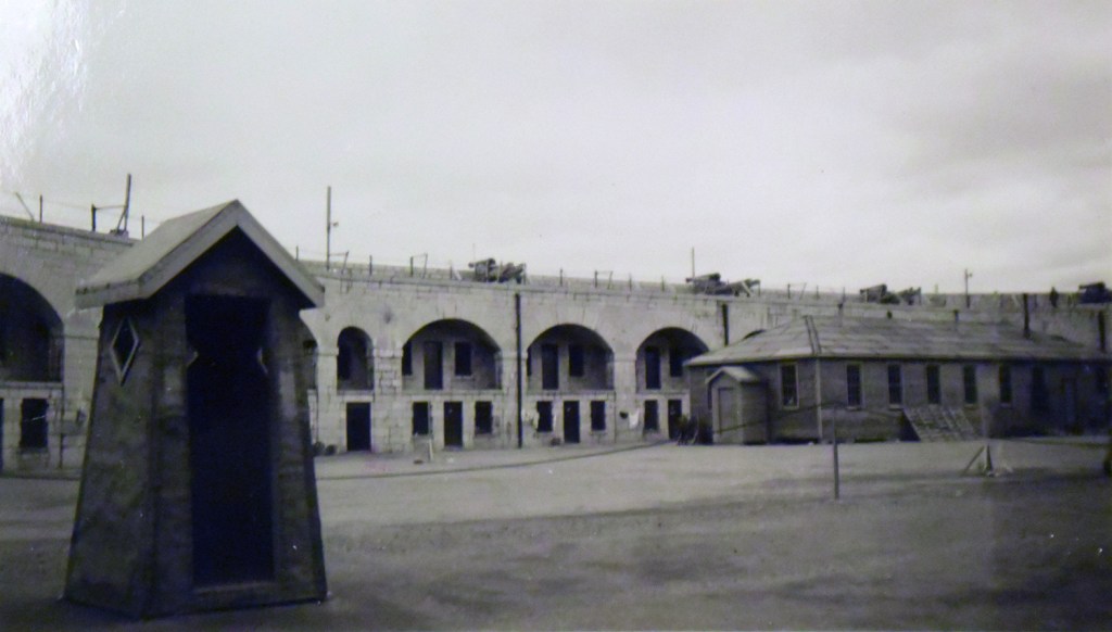 In September 1939, the fort was converted into a receiving station and temporary internment camp for German enemy aliens arrested in Ontario. The Lower Fort (Main Redoubt) was used as the main enclosure, with prisoners’ quarters located in the fort’s casemates, while the guards and camp staff were housed in the Upper Fort (Advanced Battery). Internees were relocated to Camp P (Petawawa) following its completion in late September but the increasing number of internees in custody prompted the Department of National Defence to convert Fort Henry into an internment camp in November 1939. Over the coming months, a standard army kitchen and mess, an ablution hut, and floodlights were added to bring the camp up to army standards .
