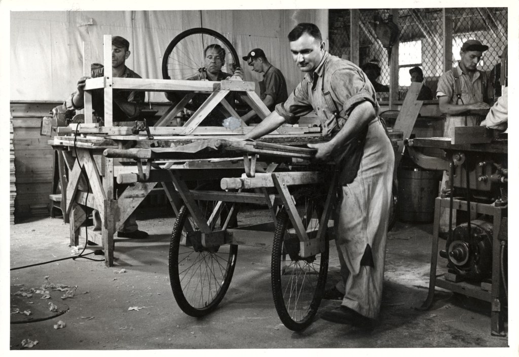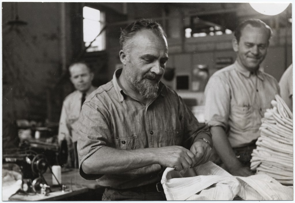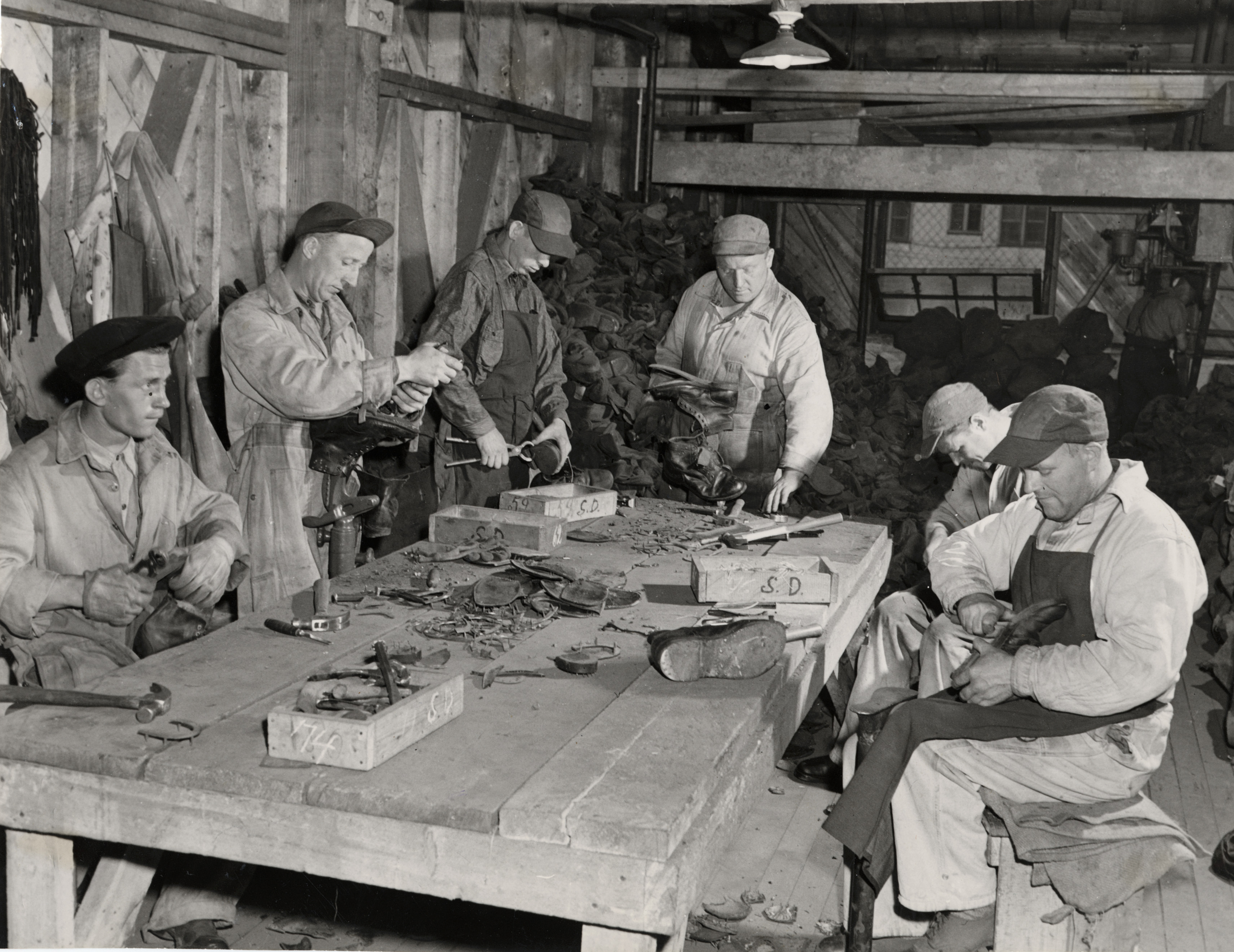 In early 1941, the Department of National Defence approved the Works Programme, an organized effort to employ civilian internees – and, later, Enemy Merchant Seamen – in light manufacturing. As the camp already had workshops from its prewar past, Camp N as well as Camp A (Farnham) and Camp S (St. Helen’s Island) were selected for the Works Programme. At Sherbrooke, the work was organized into six departments: woodworking, sewing, knitting, netting, and shoe repair. Work was divided between two shifts, with separate groups each working five-hours a day, for which prisoners earned $0.20 a day, although this was later increased to $0.50.