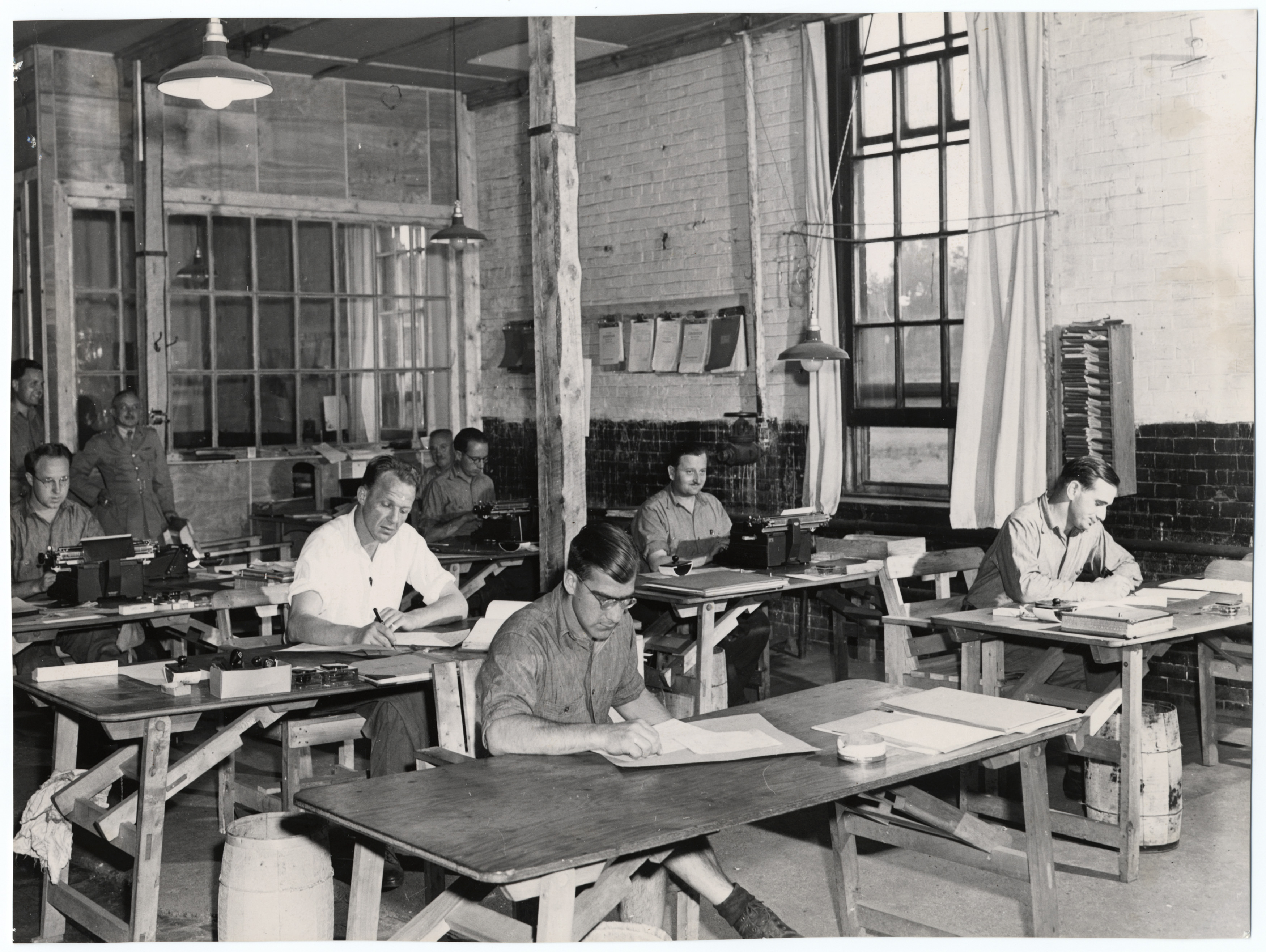 The yard’s Carpenter Shop (No. 1 Building) and Paint Shop (No. 2 Building) were initially converted into POW quarters while the machine shop and boiler shop housed the POW recreation room and workshops. Additional buildings, including a POW mess hall, guards’ quarters and mess, officers’ quarters and mess, were added before the POWs arrived.