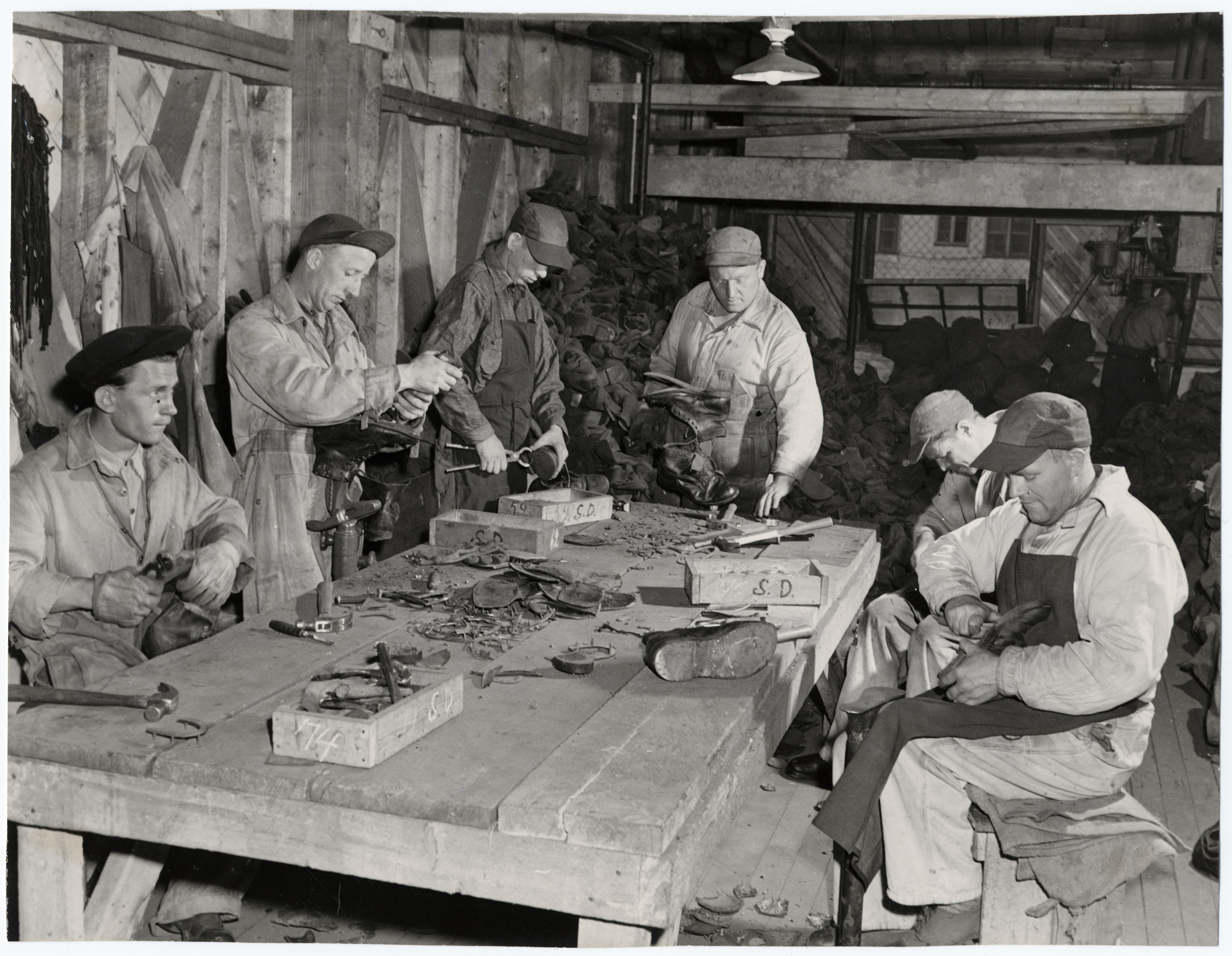 In early 1941, the Department of National Defence approved the Works Programme, an organized effort to employ civilian internees – and, later, Enemy Merchant Seamen – in light manufacturing. As the camp already had workshops from its prewar past, Camp N as well as Camp A (Farnham) and Camp S (St. Helen’s Island) were selected for the Works Programme. At Sherbrooke, the work was organized into six departments: woodworking, sewing, knitting, netting, and shoe repair. Work was divided between two shifts, with separate groups each working five-hours a day, for which prisoners earned $0.20 a day, although this was later increased to $0.50.