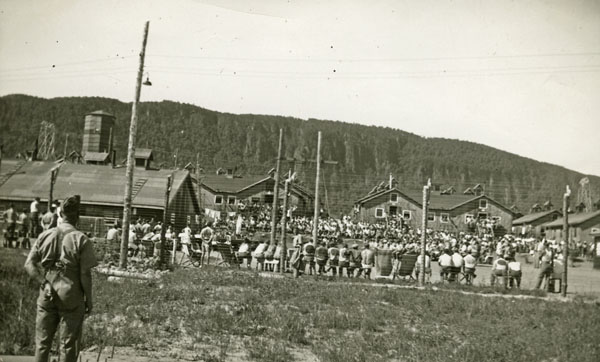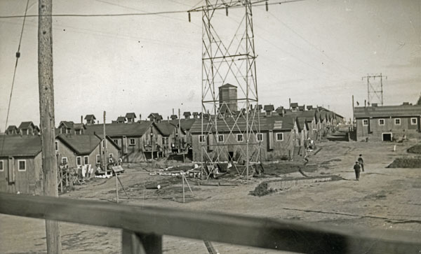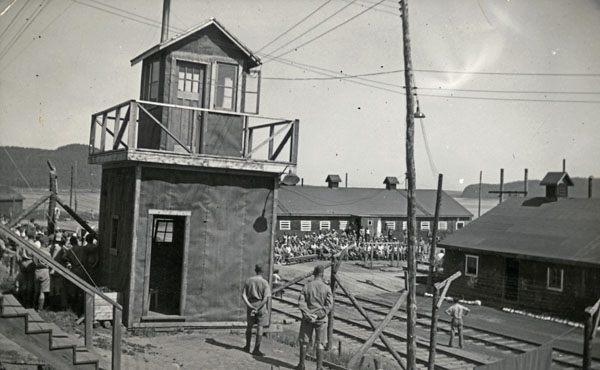 Located on the grounds of a plant owned by the Lake Sulphite Pulp Co. Ltd., Camp R’s enclosure was surrounded by two layers of barbed wire fences and five guard towers – initially only elevated platforms – each with a machine gun. Security was initially provided by soldiers of the Fort Gary Horse based out of Winnipeg but these men were later replaced by a company of the Veterans Guard of Canada.