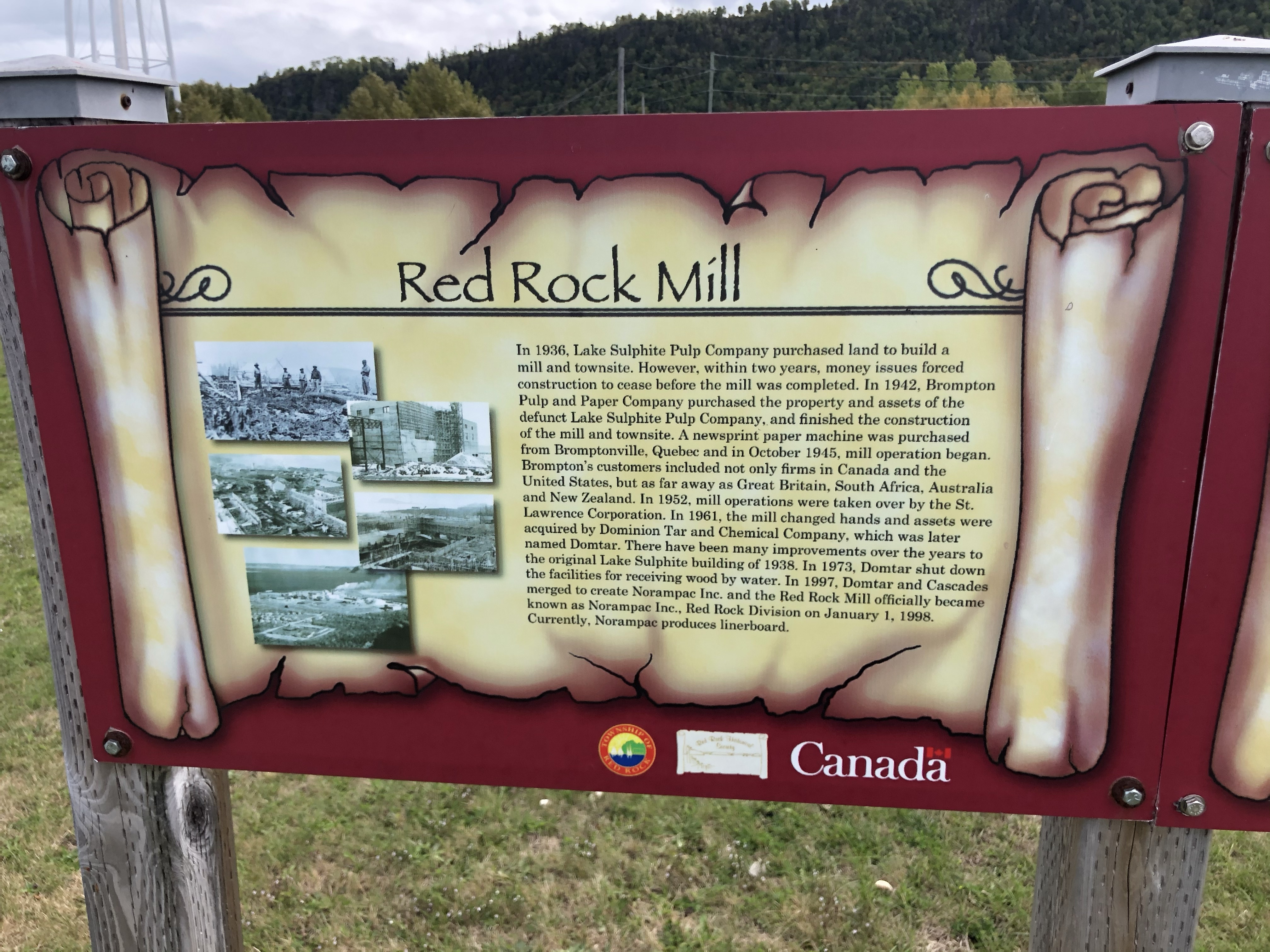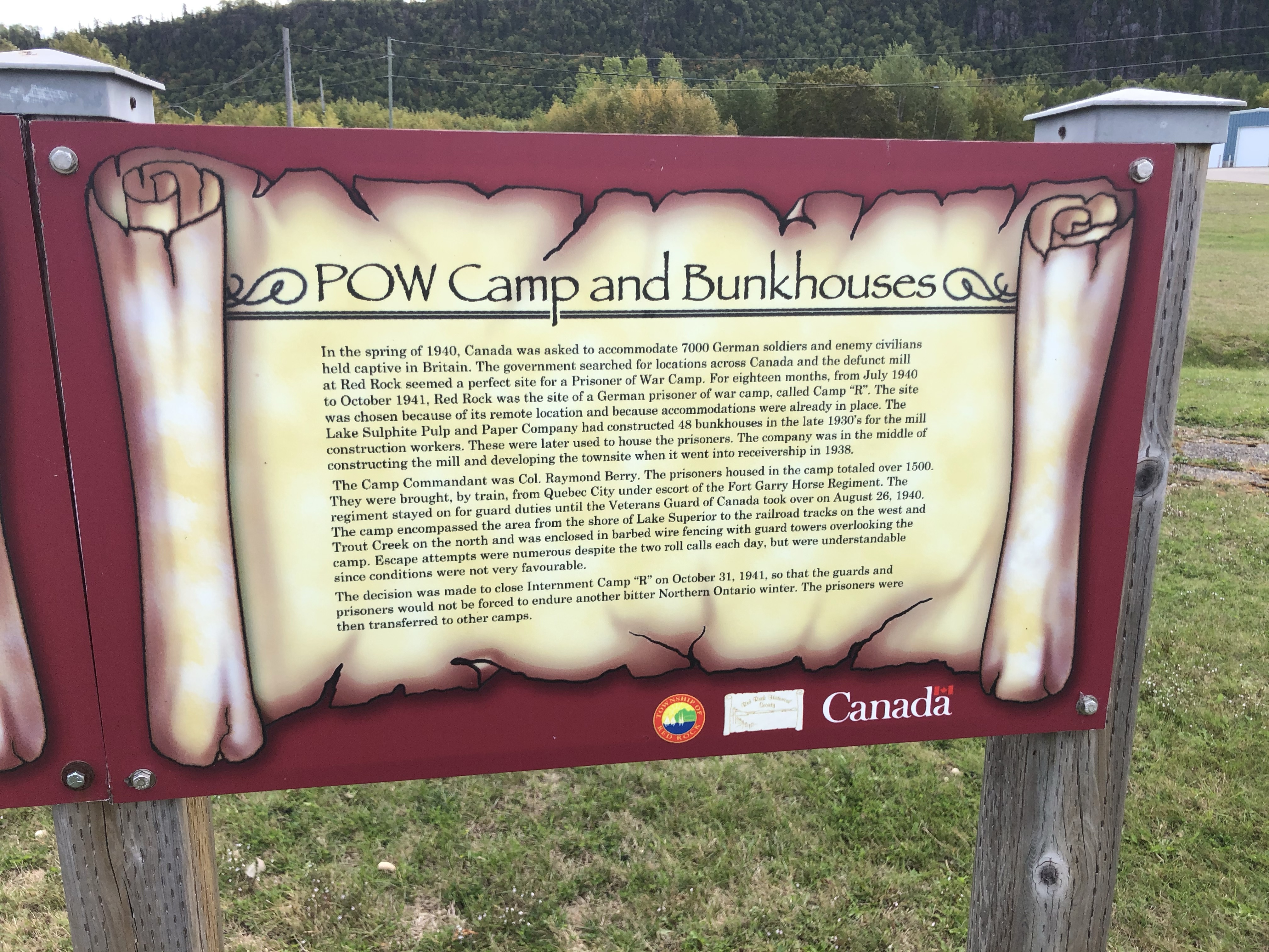 After the prisoners’ departure, Camp R closed and the property was later purchased by the Brompton Pulp and Paper Company. The mill would undergo several changes in ownership over the following decades and eventually closed in 2005. Although the buildings have since been removed, interpretative signage now marks the location and history of Camp R and the Red Rock Mill.